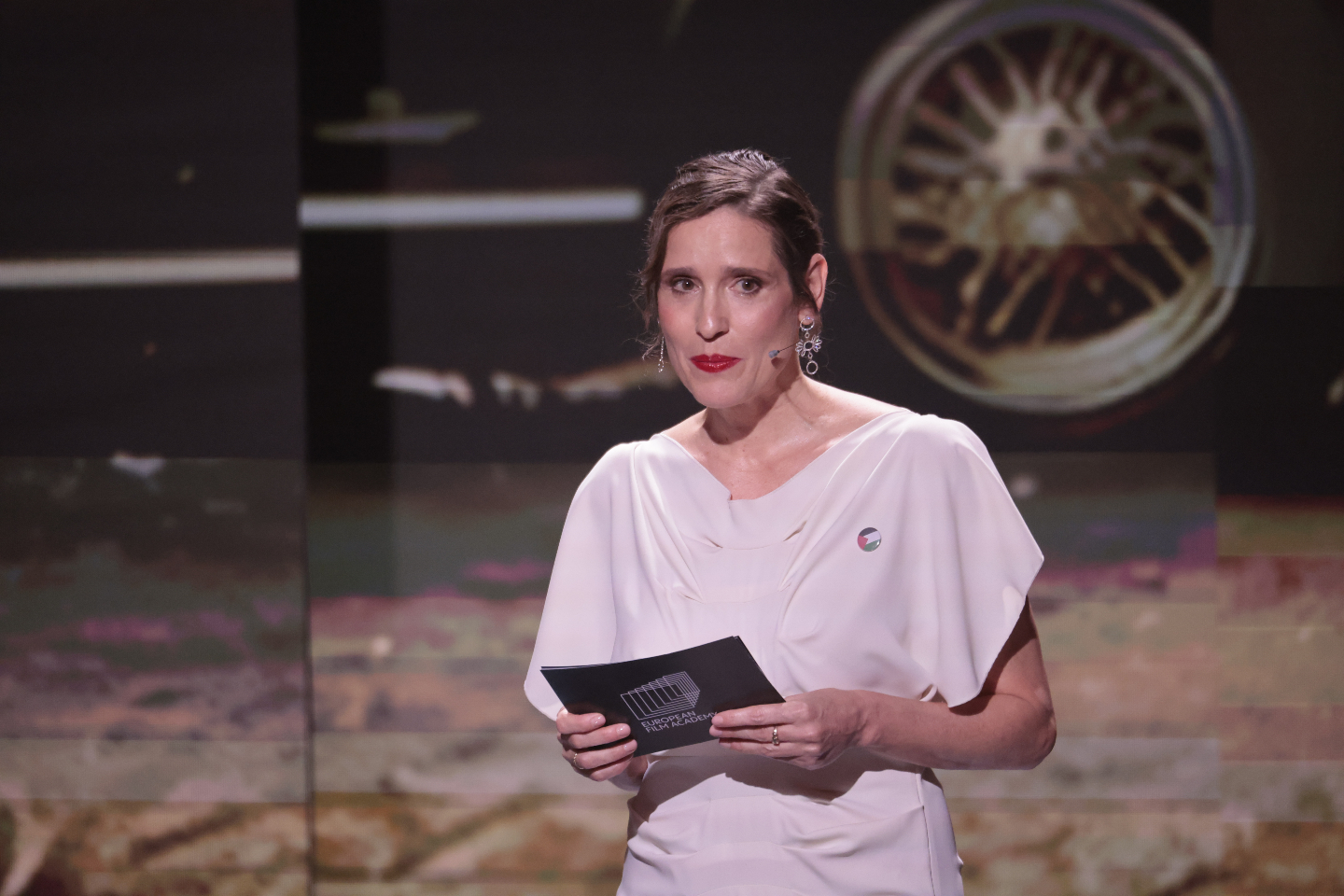 Η μεγάλη στιγμή έφτασε για την *Καλύτερη Ευρωπαϊκή Ταινία της Χρονιάς και ο Τόνι Σερβίγιο είναι επί σκηνής για να παρουσιάσει το βραβείο. Καλεί και την Πρόεδρο Ζιλιέτ Μπινός για να ανοίξουν τον φάκελο μαζί.