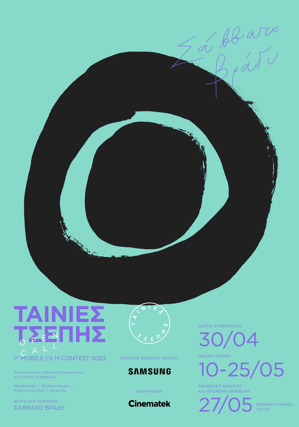 Ο διαγωνισμός θα έχει θέμα το ΣΑΒΒΑΤΟ ΒΡΑΔΥ και κάνει ανοιχτό κάλεσμα σε νέες σκηνοθέτριες και νέους σκηνοθέτες για πρωτότυπα ταινιάκια, διάρκειας 2 έως 6 λεπτών.