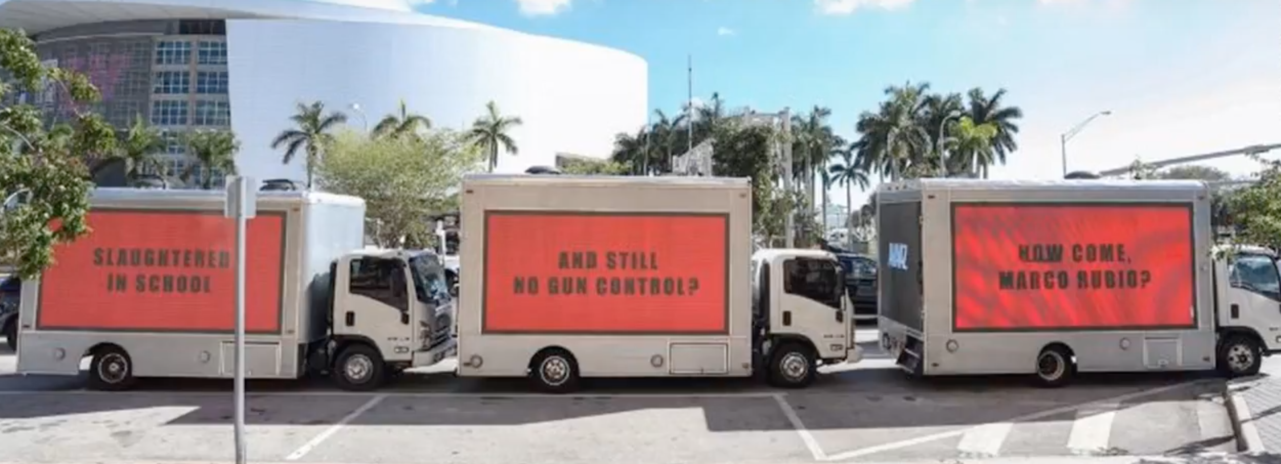 Επόμενο χτύπημα με αφορμή το μακελειό στο σχολείο της Φλόριντα. Εκεί τα φορτηγά κυκλοφόρησαν στο Μαϊάμι και αφορούσαν την οπλοκατοχή και τον Μάρκ Ρούμπιο.