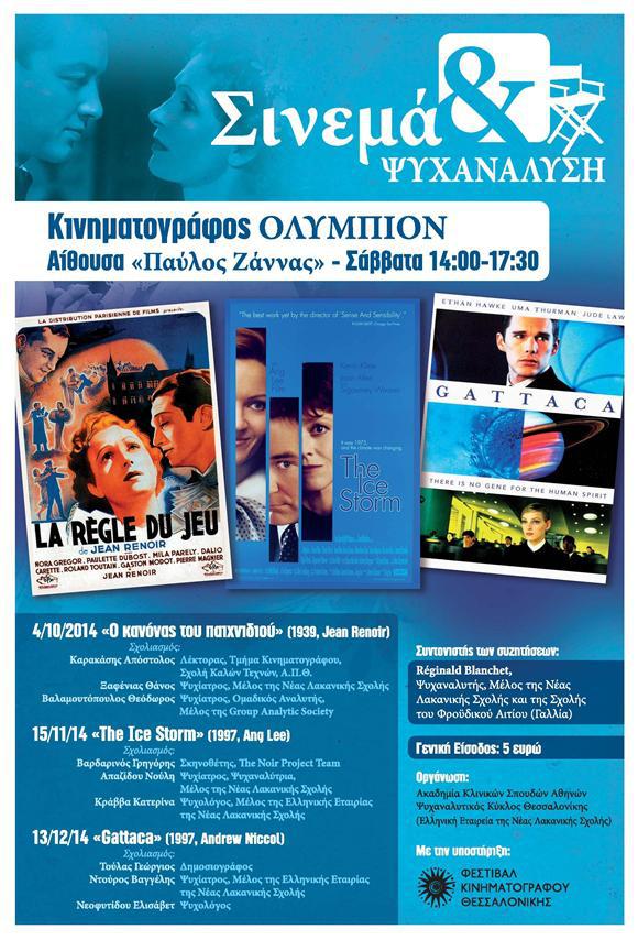 Το Φεστιβάλ Κινηματογράφου Θεσσαλονίκης υποστηρίζει τη σειρά εκδηλώσεων «Σινεμά και Ψυχανάλυση, εικόνα και ασυνείδητο» που διοργανώνεται υπό την αιγίδα της Ακαδημίας Κλινικών Σπουδών Αθηνών και του Ψυχαναλυτικού Κύκλου Θεσσαλονίκης (Ελληνική Εταιρεία της Νέας Λακανικής Σχολής), τα Σάββατα 4 Οκτωβρίου, 15 Νοεμβρίου και 13 Δεκεμβρίου 2014 στην αίθουσα Παύλος Ζάννας του Ολύμπιον (πλ. Αριστοτέλους 10, τηλ. 2310-378.400).