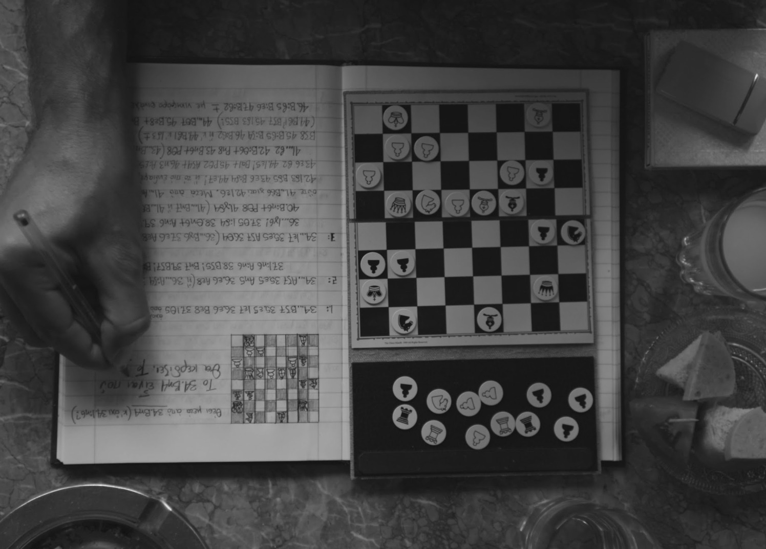Εκεί το σκάκι δεν είναι χόμπι, οι θαμώνες του έχουν αφοσιωθεί σε αυτό, έχουν ανακτήσει γνώσεις και πηγαίνουν στο μέρος και παίζουν για δεκαετίες. Στην αρχή παρατηρούμε πως τα πλάνα εντός του καφενείου είναι ασπρόμαυρα ενώ, ότι συμβαίνει εκτός καφενείου είναι έγχρωμο, αυτό στην πορεία μπλέκεται και το μοτίβο σπάει, αυτή η ασυνέπεια στα μάτια μου είναι γοητευτική. Τα έγχρωμα είναι γυρισμένα με φιλμ κανονικά. Γυρίσαμε 5 σκηνές το 2018, το υλικό αυτό μεγάλωσε με τον καιρό, γιατί πολλά πράγματα ειπώθηκαν και παρατηρήθηκαν με την μηχανή, ενώ πολλά πλάνα μπήκαν στην ταινία αφού πήραμε την χρηματοδότησει.