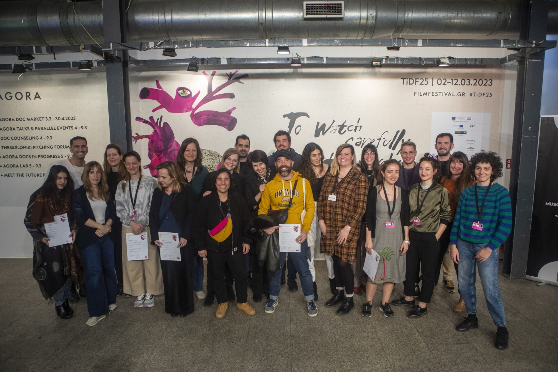 «Τις τελευταίες ημέρες, λόγω του δυστυχήματος στα Τέμπη, βιώσαμε έντονα συναισθήματα. Ωστόσο, είναι τιμή μας που υποδεχτήκαμε τόσο τα πρότζεκτ σας όσο και όλους εσάς στο 25ο Φεστιβάλ Ντοκιμαντέρ Θεσσαλονίκης. Πριν ξεκινήσουμε, θέλω να ευχαριστήσω την ομάδα της Αγοράς. Χωρίς την ενέργεια, τα χαμόγελα και τη σκληρή δουλειά σας, όλο αυτό δεν θα ήταν δυνατό να συμβεί. Συγχαρητήρια, λοιπόν, στον Θάνο, στην Έρρικα, στη Δήμητρα, στην Κατερίνα, στη Μελίν, στη Σεργίνα, στη Ραχήλ, στη Ραφαέλλα, στη φανταστική ομάδα παραγωγής μας, στους σπουδαίους εθελοντές μας, στους συναδέλφους στο τμήμα Πληροφορικής, στο τμήμα Επισκεπτών, στο τμήμα Οπτικοακουστικών, στο κινηματογραφικό μας συνεργείο, καθώς και στο ελληνικό και στο διεθνές πρόγραμμα».