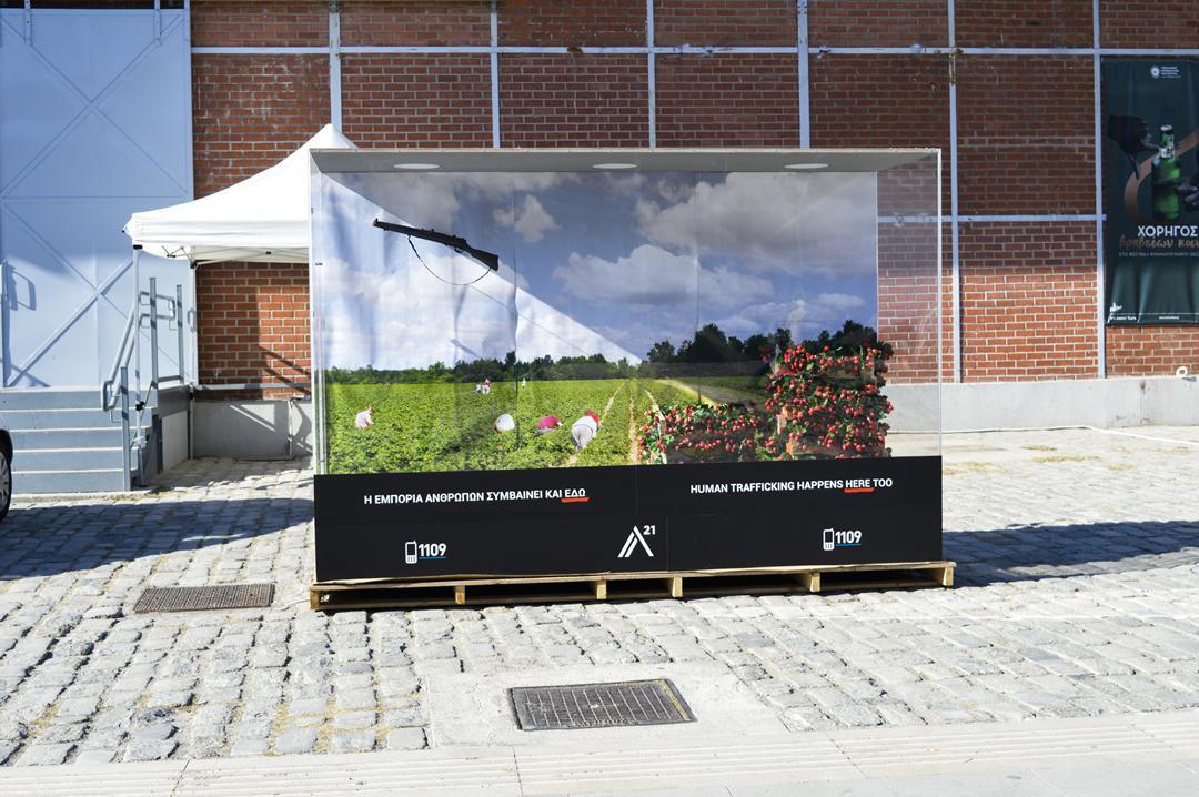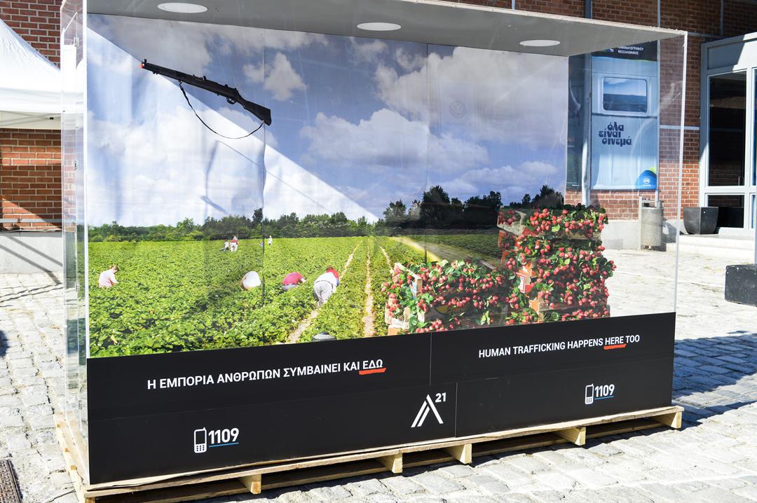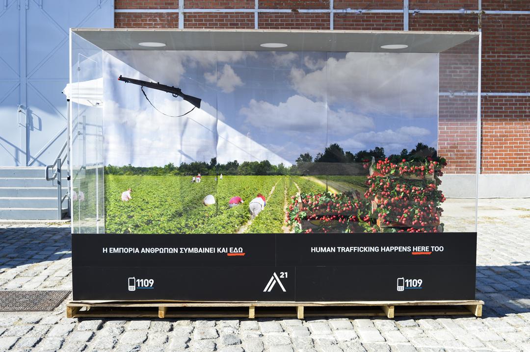 Η εγκατάσταση θα παραπέμπει με ευφάνταστο τρόπο στην πολύ γνωστή υπόθεση εμπορίας ανθρώπων με τις φυτείες φράουλας στη Μανωλάδα Ηλείας. Η υπόθεση ήρθε ξανά στο φως το 2017 όταν το Ευρωπαϊκό Δικαστήριο Ανθρωπίνων Δικαιωμάτων επέβαλε πρόστιμο στην Ελλάδα γιατί δεν εξέτασε επαρκώς την υπόθεση το 2013. Στην εγκατάσταση θα μπορεί κανείς να πληροφορηθεί για την εμπορία ανθρώπων, καθώς και για τους τρόπους με τους οποίους μπορεί να δραστηριοποιηθεί ενάντιά της αλλά και να γνωρίσει τη δράση της Α21. Επίσης, μέσω αυτής της πρωτοβουλίας, προωθείται και η Γραμμή Πληροφόρησης για την Εμπορία Ανθρώπων 1109 στην οποία μπορεί κανείς να καλέσει για να καταγγείλει κάποιο ύποπτο περιστατικό. Η Γραμμή Πληροφόρησης για την Εμπορία Ανθρώπων 1109 ξεκίνησε να λειτουργεί το 2012 και έχει δεχθεί περισσότερες από 2.000 κλήσεις, οδηγώντας στη διάσωση περισσοτέρων από 100 θυμάτων.