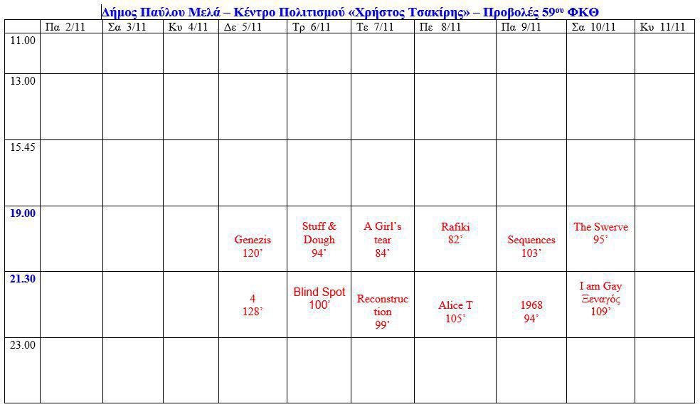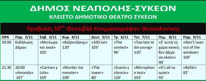 *Κλειστό Δημοτικό Θέατρο Συκεών (Ρήγα Φεραίου και Μεγάρων, τηλ. 2310268.058), Γενική είσοδος: 5 ευρώ, Ισχύουν οι διαπιστεύσεις, οι προσκλήσεις, τα κουπόνια προβολών και η CineκάρταF.