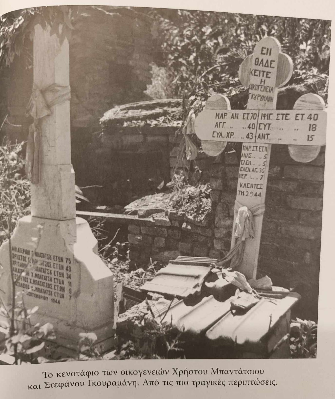 Εκεί είδα καμιά δεκαριά σκοτωμένους. Έπεσα επάνω τους. Εκεί ήταν και η Τερψιχόρη, η γυναίκα του Γρηγόρη του Λασκαρίδη, σκοτωμένη και θήλαζε το παιδί της! Το αίμα της πεταγόταν σαν βρύση και με έλουζα ολόκληρη. Το μωρό βύζαινε και έκλαιγε μαζί. Όμως δεν τολμούσα να το ησυχάσω. Επρεπε να κάνω κι εγώ τη σκοτωμένη. Σε λίγο πλησίασαν 3-4 Ταγματασφαλίτες και γελάγανε με το μωρό που βύζαινε και έκλαιγε. Εγώ μπρούμυτα. Μου ρίχνουν μια κλοτσιά στα πλευρά να δουν αν ζούσα. Εγώ τσιμουδιά… Μπορεί στη στοίβα να ήταν κι άλλοι ζωντανοί και να κάναν το ίδιο, δεν ξέρω».