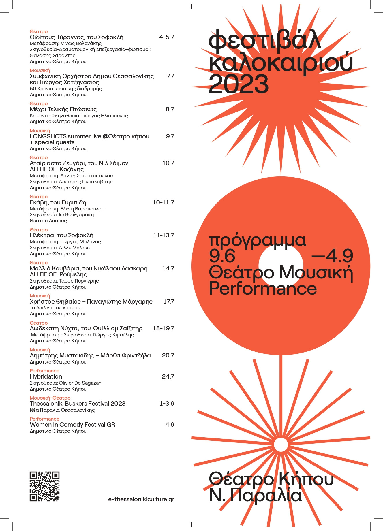 Το πρόγραμμα περιλαμβάνει 23 συναυλίες, 11 θεατρικές παραστάσεις και 3 καλλιτεχνικά performances με την πληθώρα παραστάσεων να χαρίζει αμέτρητες επιλογές στους θεατές.
