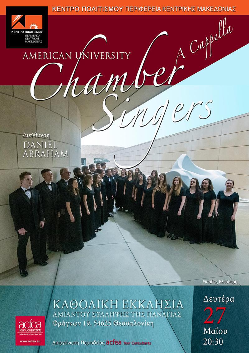 Χορωδιακή Μουσική A Cappella στους χώρους της Καθολικής Εκκλησίας στη Θεσσαλονίκη (Φράγκων 19) θα παρουσιάσουν σε ένα πλούσιο πρόγραμμα μέλη επίλεκτου χορωδιακού σχήματος του American University Chamber Singers από την Washington την Δευτέρα 27 Μαΐου στις 20.30 με ελεύθερη είσοδο για το κοινό.