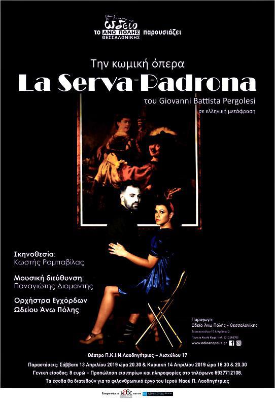Στις 13 και 14 Απριλίου 2019 στο ειδικά διαμορφωμένο θέατρο της οδού Αισχύλου 17 της Άνω Πόλης οι φίλοι του λυρικού θεάτρου θα έχουν την ευκαιρία να παρακολουθήσουν την όπερα του Τζοβάνι Μπατίστα Περγκολέζι «Η Υπηρέτρια Κυρία» (La Serva Padrona) που παρουσιάστηκε για πρώτη φορά στο Θέατρο του Αγίου Βαρθολομαίου στη Νάπολη το 1733.