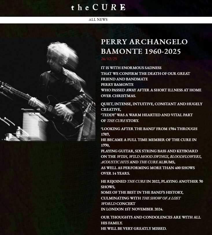«Με μεγάλη θλίψη επιβεβαιώνουμε τον θάνατο του μεγάλου μας φίλου και μέλους της μπάντας Πέρι Μπαμόντε. Ήσυχος, έντονος, διαισθητικός, σταθερός και εξαιρετικά δημιουργικός, ο «Τέντι» ήταν ένα ζεστό και ζωτικό μέρος της ιστορίας των The Cure. Οι σκέψεις και τα συλλυπητήριά μας πηγαίνουν σε όλη την οικογένειά του, θα μας λείψει πολύ», αναφέρεται στη δήλωση.