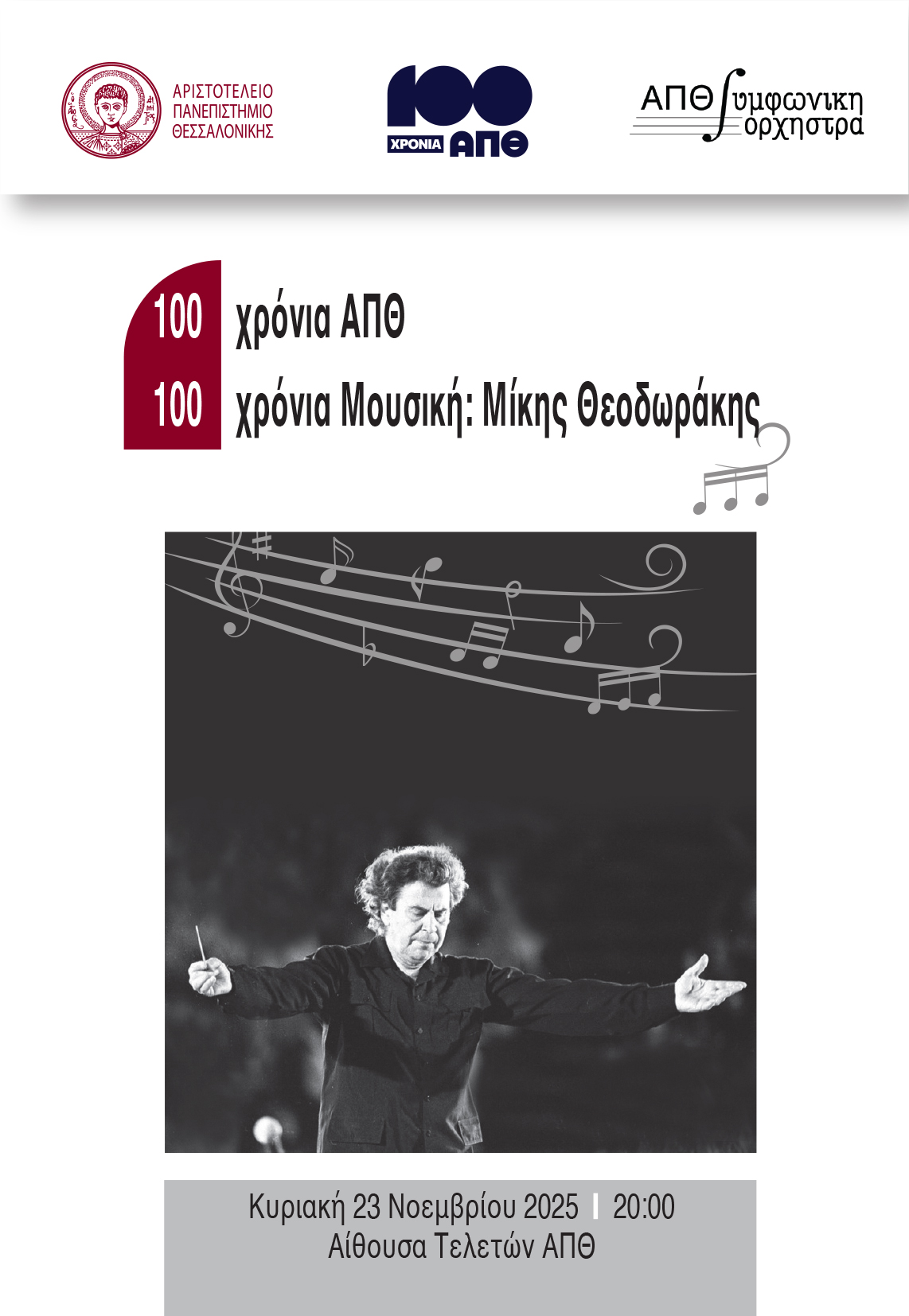 «100 χρόνια ΑΠΘ – 100 χρόνια Μουσική: Μίκης Θεοδωράκης» είναι το θέμα της επετειακής συναυλίας που διοργανώνει το Αριστοτέλειο Πανεπιστήμιο, την Κυριακή 23 Νοεμβρίου 2025 και ώρα 20.00, στην Αίθουσα Τελετών.