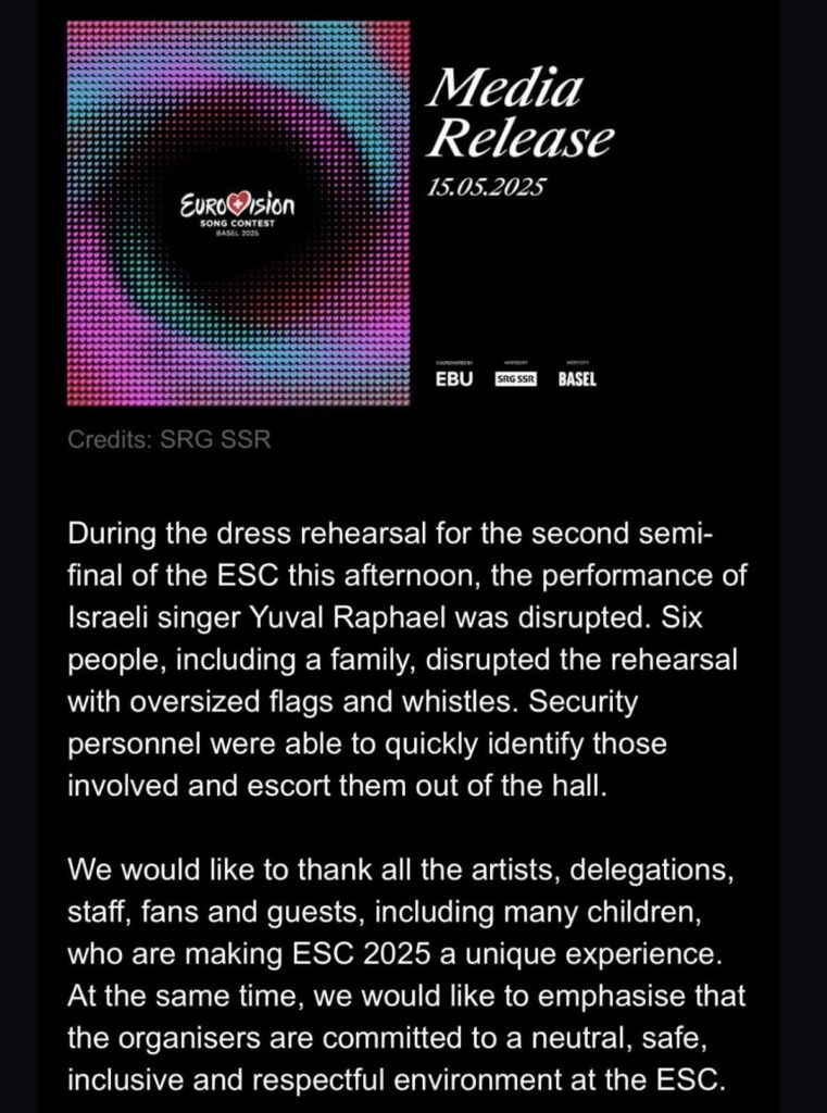 Συγκεκριμένα, σύμφωνα με ανακοίνωση της Δημόσιας Ραδιοτηλεόρασης της Ελβετίας (SRG SSR) που μεταφέρεται σε ρεπορτάζ του Σωτήρη Χαραλαμπόπουλου για το ieidiseis.gr, κατά τη διάρκεια της πρόβας για τον δεύτερο ημιτελικό της Eurovision 2025, σήμερα (15/5) το απόγευμα, διακόπηκε η εμφάνιση της Ισραηλινής τραγουδίστριας, Yuval Raphael. Έξι άτομα, συμπεριλαμβανομένης μιας οικογένειας, διέκοψαν την πρόβα με υπερμεγέθεις σημαίες και σφυρίχτρες. Το προσωπικό ασφαλείας μπόρεσε γρήγορα να εντοπίσει τους εμπλεκόμενους και να τους συνοδεύσει έξω από την αίθουσα του «St. Jakobshalle».