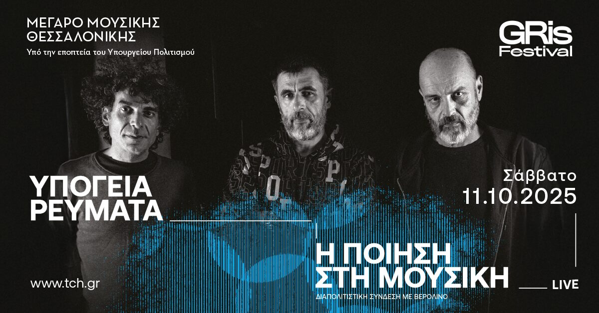 Έχοντας εμπνευστεί και μελοποιήσει μοναδικά ποιήματα σπουδαίων Ελλήνων δημιουργών, το θρυλικό συγκρότημα Υπόγεια Ρεύματα θα πραγματοποιήσει μία ξεχωριστή συναυλία στο Μέγαρο Μουσικής Θεσσαλονίκης, Αίθουσα Αιμίλιος Ριάδης, το Σάββατο 11 Οκτωβρίου 2025, η οποία με στόχο την συνολική παρουσίαση αυτών των εξαιρετικών πρωτότυπων συνθέσεων, νέων και παλαιότερων, αποτελεί τον πρώτο σταθμό στο ταξίδι της διαπολιτιστικής σύνδεσης με Βερολίνο της κλασικής μας κληρονομιάς με τη σύγχρονη καλλιτεχνική έκφραση.