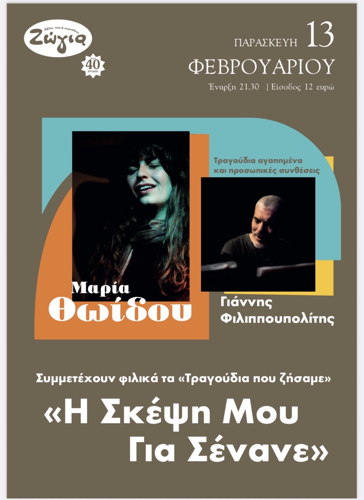*Ζώγια | Πέμπτη 12 Φεβρουαρίου στις 21:00 | Τιμές εισιτηρίων: 12 ευρώ | Πληροφορίες και κρατήσεις: 231 0243 459