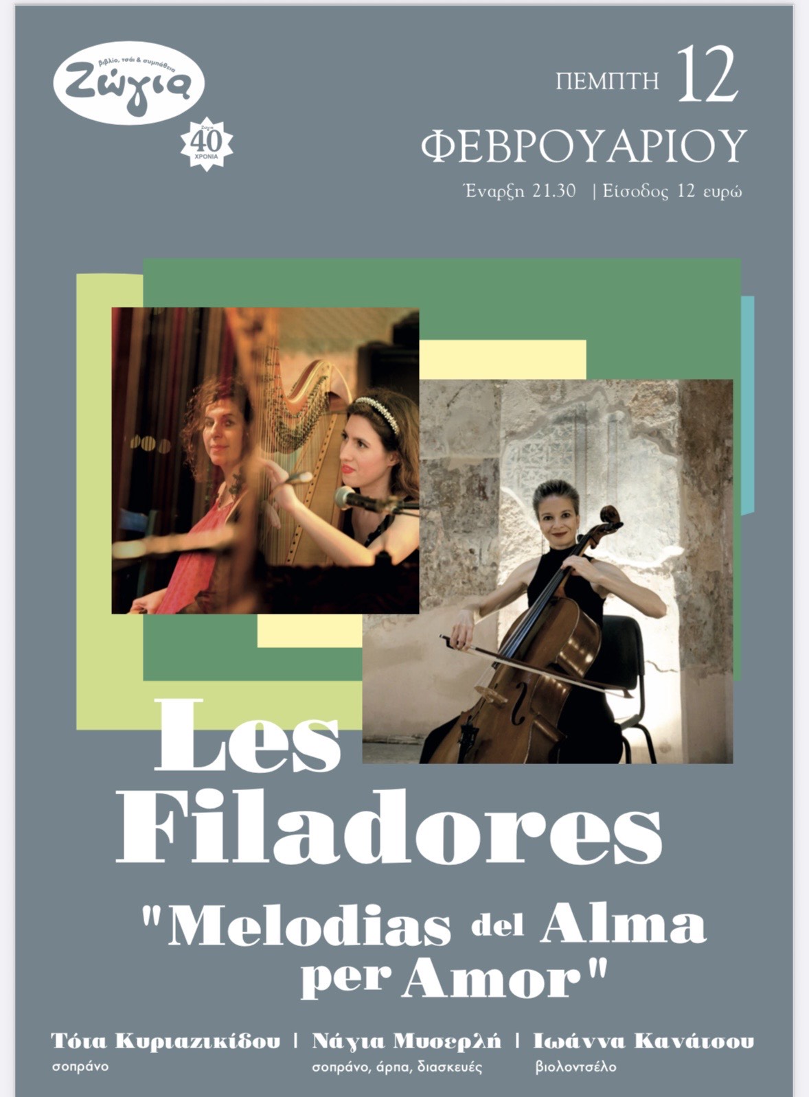 Συντελεστές: Σοπράνο: Τότα Κυριαζικίδου – Νάγια Μυσερλή | Άρπα – Διασκευές: Νάγια Μυσερλή | Βιολοντσέλο: Ιωάννα Κανάτσου