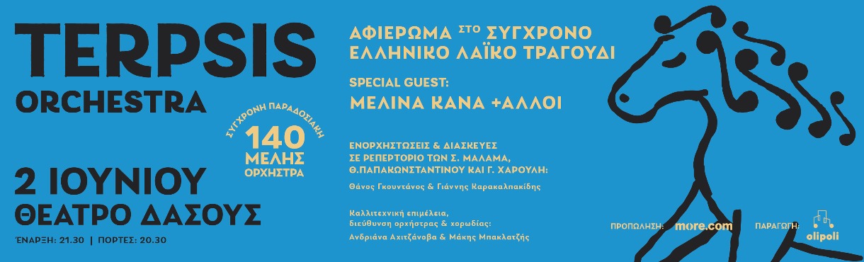 Η 140μελής σύγχρονη παραδοσιακή ορχήστρα Terpsis Orchestra, έρχεται φέτος για μία μοναδική συναυλία στις 2 Ιουνίου στο Θέατρο Δάσους σε ένα αφιέρωμα στο σύγχρονο ελληνικό λαϊκό τραγούδι. Αγαπημένα τραγούδια των Σωκράτη Μάλαμα, Θανάση Παπακωνσταντίνου και Γιάννη Χαρούλη, παρουσιάζονται μέσα από νέες πρωτότυπες ενορχηστρώσεις δημιουργώντας έναν ζωντανό διάλογο ανάμεσα στην παράδοση και το σήμερα.