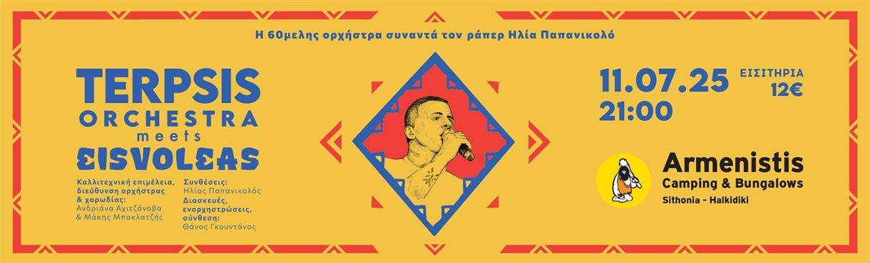Τα 100 μέλη της ορχήστρας σύγχρονης παραδοσιακής μουσικής, Terpsis Orchestra, συναντούν τον ράπερ και συνθέτη Ηλία Παπανικολό, γνωστό στο κοινό ως Εισβολέα, την Παρασκευή 11 Ιουλίου στο Camping Αρμενιστής, για μία και μοναδική μουσική παράσταση.