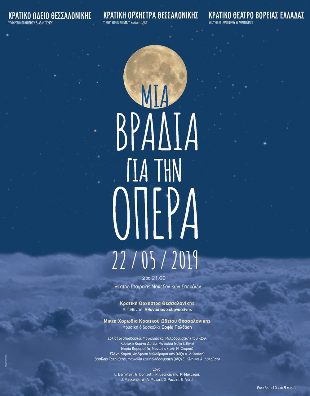 Το Κρατικό Ωδείο Θεσσαλονίκης σε συνεργασία με την Κρατική Ορχήστρα Θεσσαλονίκης και το Κρατικό Θέατρο Βορείου Ελλάδος, παρουσιάζει την Τετάρτη 22 Μαΐου 2019, ώρα 21.00, στο Θέατρο Εταιρείας Μακεδονικών Σπουδών «Μια βραδιά για την Όπερα».