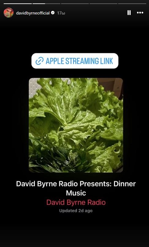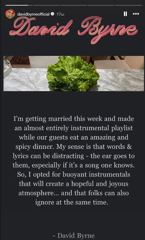 «Παντρεύομαι αυτή την εβδομάδα και έφτιαξα μια playlist σχεδόν εξ ολοκλήρου με ορχηστρικά κομμάτια, για να συνοδεύσουν το υπέροχο και πικάντικο δείπνο των καλεσμένων μας», έγραψε ο David Byrne στο Instagram, προσθέτοντας ένα link προς μια playlist στο Apple Music.