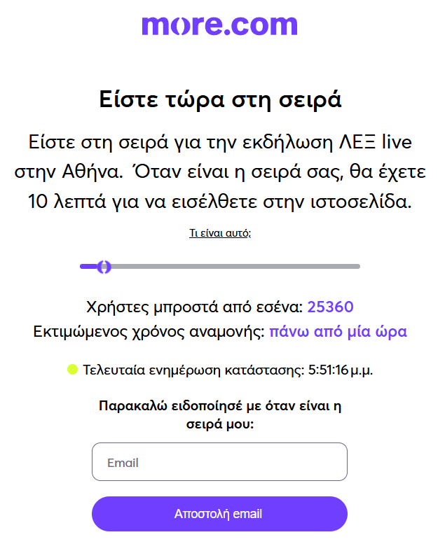 Αξίζει να σημειωθεί ότι μέσα σε λίγα μόλις λεπτά, η διαδικτυακή ουρά έχει αναμονή πάνω από μια ώρα με τουλάχιστον πάνω από 25.000 άτομα να περιμένουν να κλείσουν το εισιτήριό τους!