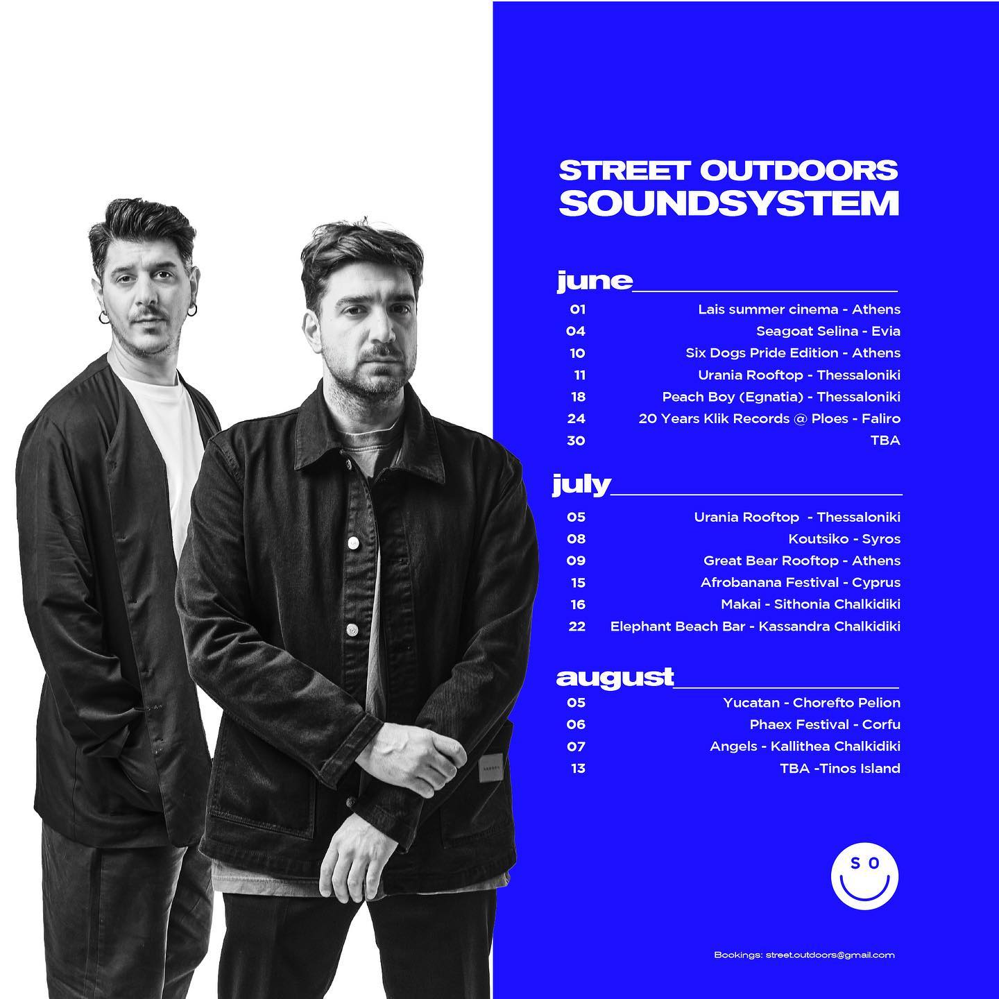 “Σήμερα τα πάρτι είναι full time job για εμένα, προσπαθούμε να κάνουμε αρκετά outdoor event. Όταν όλο αυτό μεγάλωσε και μοιραία θέλαμε να κάνουμε πιο μεγάλα πράγματα και πιο επαγγελματικά, αποκτώντας μεγαλύτερη υπόσταση και περισσότερο κοινό καταλάβαμε πως θα γίνει όλο και πιο δύσκολο σε ένα random στενό στα κέντρα των αστικών πόλεων χωρίς να έχει συνέπειες. Με το outdoor πάρτι μπορούσαμε να κάνουμε events 4-5 μήνες τον χρόνο, οπότε κρατήσαμε σε πολλές φάσεις τον τίτλο ως brand και δημιουργήσαμε και κλειστά events. Eγώ προτιμώ τα εξωτερικά και τα απογευματινά. Εμείς ήμασταν από τους πρώτους που παίζαμε μουσικές οι οποίες δεν παιζόντουσαν εύκολα, δεν παίζαμε ποτέ αυστηρά, δεν μας ένοιαζε η ροή ιδιαίτερα, δεν είπαμε ποτέ πως στην μόδα είναι αυτό το είδος οπότε πρέπει να το ακολουθήσουμε, δεν με αφορά η μόδα πολύ. Όταν ξεκινήσαμε να “μεγαλώνουμε” υπήρχε πολλοίς κόσμος που ερχόταν στα πάρτι και συνειδητοποιούσε πως του αρέσει η ηλεκτρονική μουσική και περνάει καλά με αυτή. Έτσι κάπως ξεκίνησαν να μας προσεγγίζουν επιχειρηματίες και να ρίχνουν προτάσεις, κάπου εκεί δημιουργήθηκε το “Street Outdoors Sound System”, ένα format που θα παίξω εγώ με τον Γιώργο μουσική και θα παρουσιάσουμε τον ήχο του πάρτι μας. Ένα representation του πάρτι από τους δημιουργούς του.”