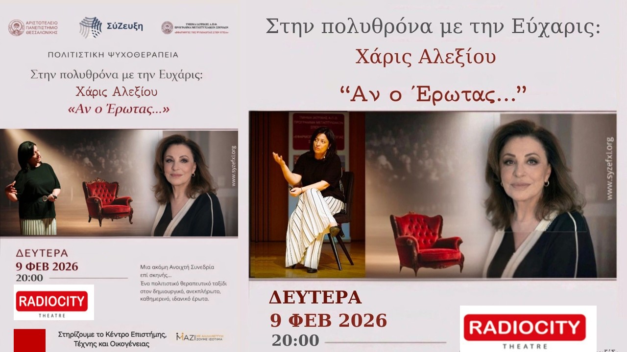 Σε συνέχεια της μεγάλης ανταπόκρισης του κόσμου της Θεσσαλονίκης στην Πολιτιστική Ψυχοθεραπεία, που παρουσιάστηκε για πρώτη φορά τον Απρίλιο 2025 και έχει ως τώρα προσελκύσει πάνω από 2500 θεατές, η Πολυθρόνα με την Εύχαρις επιστρέφει στην Σκηνή του Βασιλικού Θεάτρου, από το Αριστοτέλειο Πανεπιστήμιο Θεσσαλονίκης, και το Κέντρο Επιστήμης, Τέχνης, και Οικογένειας, ΣύΖευξη με τιμώμενη προσκεκλημένη τη Χαρούλα Αλεξίου.