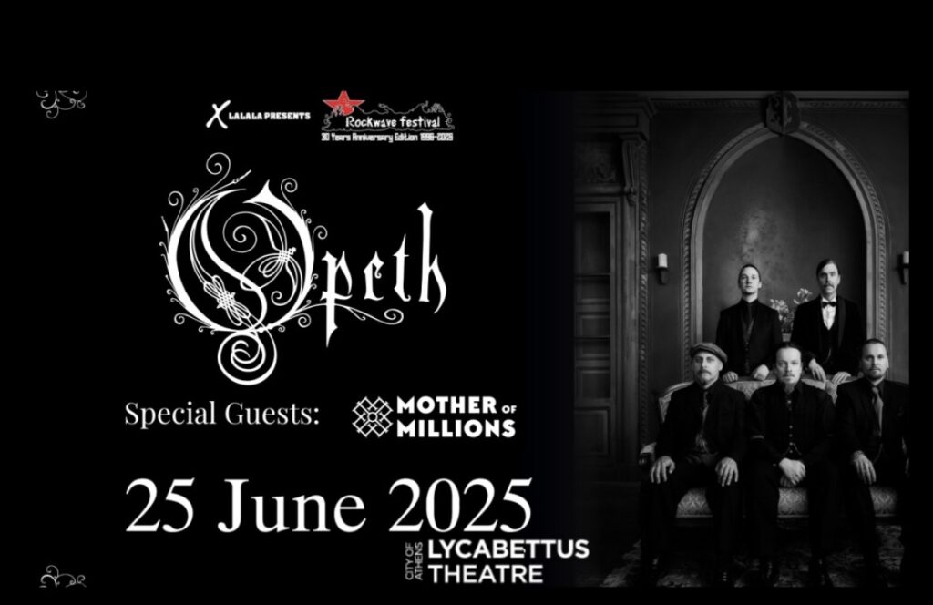 Στην αγκαλιά του progressive σκοταδιού: Οι Opeth έτοιμοι να σαρώσουν την καλοκαιρινή Ελλάδα και οι εκρηκτικοί Mother of Millions θα ανοίξουν το show! Δύο από τις καλύτερες prog κυκλοφορίες της χρονιάς, συναντιούνται στο πιο συγκινητικό θέατρο της Αθήνας για μια βραδιά που αναμένεται να προκαλέσει ρίγη ανατριχίλας, ψυχική ανάταση και ατελείωτες ώρες πνευματικής αναζήτησης.
