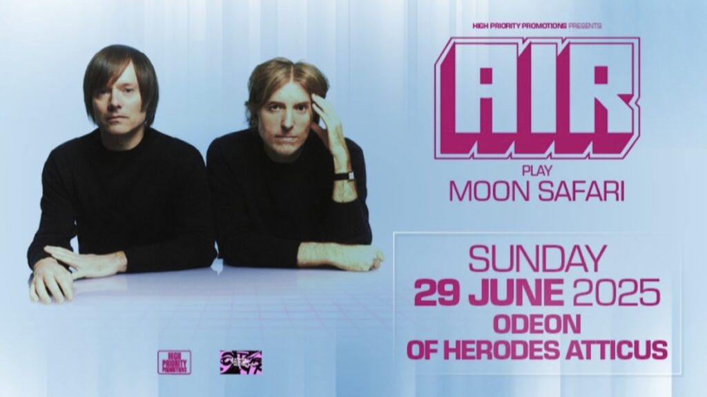 Οι Air έρχονται να μας μαγέψουν με μια μοναδική συναυλία την Κυριακή, 29 Ιουνίου, στο Ωδείο Ηρώδου του Αττικού στο πλαίσιο του Φεστιβάλ Αθηνών Επιδαύρου, μεταφέροντάς μας σε ένα καλοκαιρινό σαφάρι κάτω από το φως του φεγγαριού της Ακρόπολης.