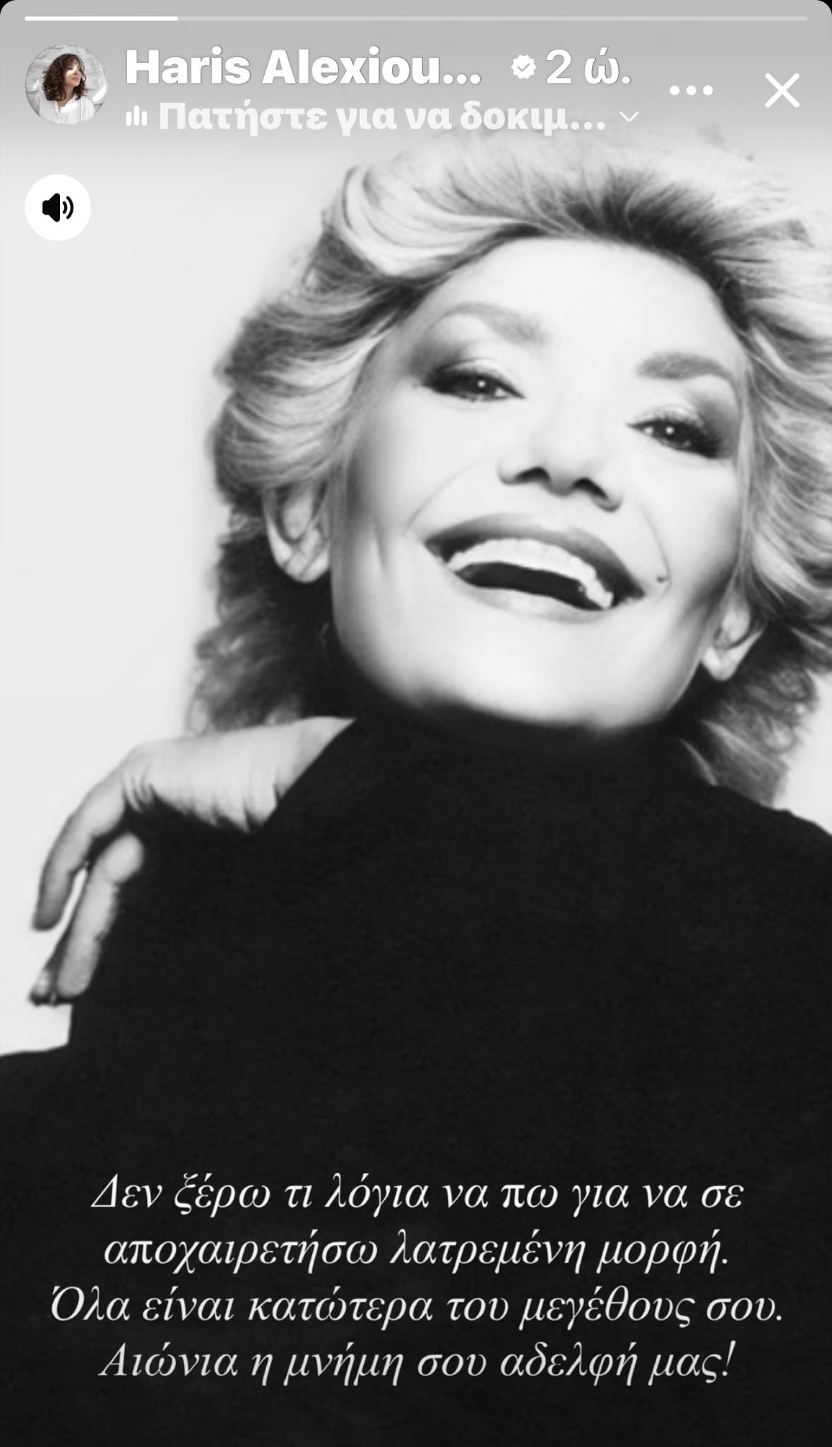 Υπέροχη γενναιόδωρη Κυρία. Από οπου πέρασες  Άφησες πίσω σου πολιτισμό. Καλύτερα καμαρίνια, καλύτερό ήχο, καλύτερα φώτα! Δεν ξέρω άλλη τραγουδίστρια με τη δική σου τεχνική, Το δικό σου ταπεραμέντο. Ξεκουράσου τώρα αρχόντισσα, Θα ζεις πάντα στην καρδιά μας. Σε ευχαριστούμε για όλα αυτά που μας έμαθες και μας χάρισες.