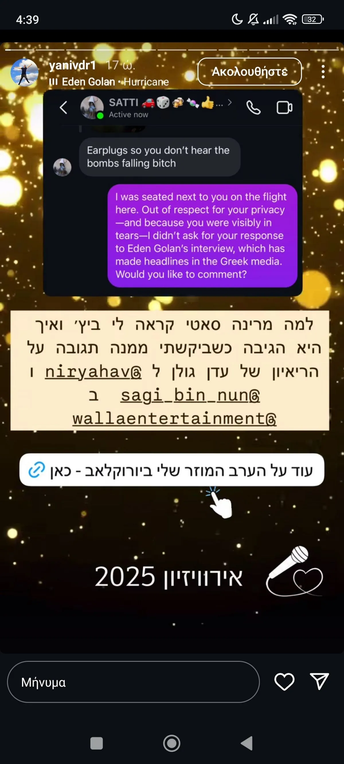 Έντονο επεισόδιο σημειώθηκε στη Βασιλεία της Ελβετίας, στο περιθώριο της πρόβας για τον πρώτο ημιτελικό της Eurovision 2025, με τον δημοσιογράφο του ισραηλινού ιστότοπου Walla, Γιανίβ Ντορνμπούς, να έρχεται σε ευθεία αντιπαράθεση με τη Μαρίνα Σάττι που πέρσι είχε εκπροσωπήσει την Ελλάδα στον διαγωνισμό.