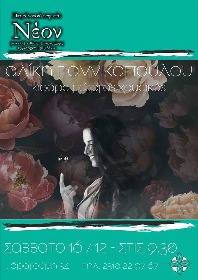 Η Αλίκη Γιαννικοπούλου έρχεται ξανά στο ΝΕΟΝ και ερμηνεύει με την υπέροχη φωνή της αγαπημένα και επιλεγμένα έντεχνα και λαϊκά, με τη συνοδεία του Γιώργου Χρυσικού στην κιθάρα, το Σάββατο 16 Δεκεμβρίου.
