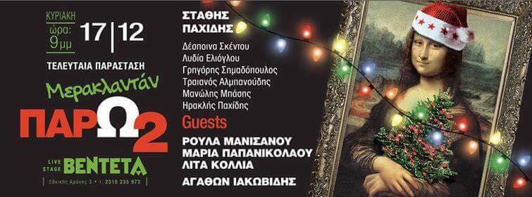 Η μουσική σκηνή Βεντέτα live stage, Εθν. Αμύνης 3, τηλ: 2310234973 υψηλοφρόνως παρουσιάζει την Κυριακή 17/12/2017 στις 9 μμ νταν (ναιιιιιιι, νωρίς νωρίς, να προλάβουμε και τα λεωφορεία της επιστροφής) την εξωκάρδια μουσική παράσταση του Στάθη Παχίδη «Παρ Ω2» (λειτουργεί ως ΙΕΚ αγέλαστων ή ως Θεραπευτήριον φάλτσων χορωδών – ε ναι, θα τραγουδήσουμε όλοι μαζί).