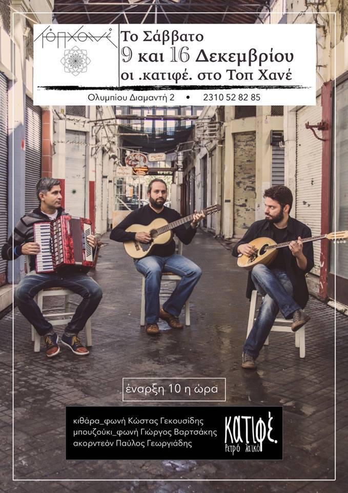 Ελληνικό Αστικό Λαϊκό Τραγούδι με ρεμπετοκίθαρο, ακορντεόν και τρίχορδο μπουζούκι το Σάββατο στο Τοπ Χανέ παρέα με τους Κατιφέ. Στην κιθάρα – φωνή ο Κώστας Γεκουσίδης, στο μπουζούκι – φωνή ο Γιώργος Βαρτσάκης και στο ακορντεόν ο Παύλος Γεωργιάδης.