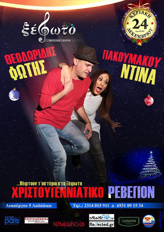 Υπάρχουν πολλοί τρόποι να υποδεχτείς τα Χριστούγεννα. Στο ΞΕΦΩΤΟ, τους γνωρίζουν όλους! Γιατί τα Χριστούγεννα, θέλουν καλή παρέα. Θέλουν ατμόσφαιρα και μουσική. Θέλουν κέφι και τραγούδι. Θέλουν να νιώθεις όμορφα και να απολαμβάνεις κάθε στιγμή. Θέλουν να «αφήνεσαι» και να βλέπεις το… ΞΕΦΩΤΟ Κυριακή, 24 Δεκεμβρίου, ο Φώτης Θεοδωρίδης και η Ντίνα Γιακουμάκου μας καλούν για μία νύχτα εκτόνωσης και διασκέδασης, γεμάτης υποσχέσεις και φως. Με τραγούδια της καρδιάς και του έρωτα, απ’ αυτά που «μιλάνε» μέσα σου και αποκαλύπτουν τον πιο γνήσιο εαυτό σου, γιορτάζουμε τα Χριστούγεννα, εκεί, στην πιο «ζεστή» μουσική σκηνή της πόλης. Ελάτε να ξημερώσουμε λαϊκά, με πενιές και αυθεντικό ελληνικό κέφι. Στο πάλκο οι μουσικοί: Μανώλης Μπάσης (μπουζούκι), Χριστόδουλος Πουλιούδης (κιθάρα), Πάνος Κοσμίδης (πιάνο) και Μίλτος Σπυριδόπουλος (μπάσο) *Ξέφωτο, Λυκούργου 5, Λαδάδικα, Ώρα Έναρξης 23.00