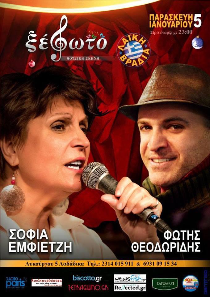 Με την μεγάλη μας λαϊκή τραγουδίστρια Σοφία Εμφιετζή, με τη μεγάλη ιστορία που δε χρειάζεται πλέον συστάσεις και τον Φώτη Θεοδωρίδη, την ψυχή του Ξέφωτου, ένα δίδυμο που από πέρσι έχει φτιάξει μια ιδιαίτερη κατάσταση και που παίζουν για πρώτη φορά μαζί φέτος στο ανανεωμένο Ξέφωτο.