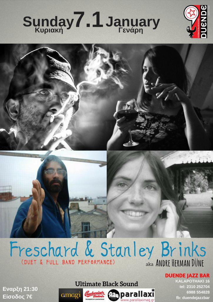 Το Duende Jazz Bar θα έχει την τιμή και τη χαρά να φιλοξενήσει για πρώτη φορά στη Θεσσαλονίκη, το ντουέτο των Freschard & Stanley Brinks από το Βερολίνο, για μία και μοναδική εμφάνιση την Κυριακή 7 Ιανουαρίου!