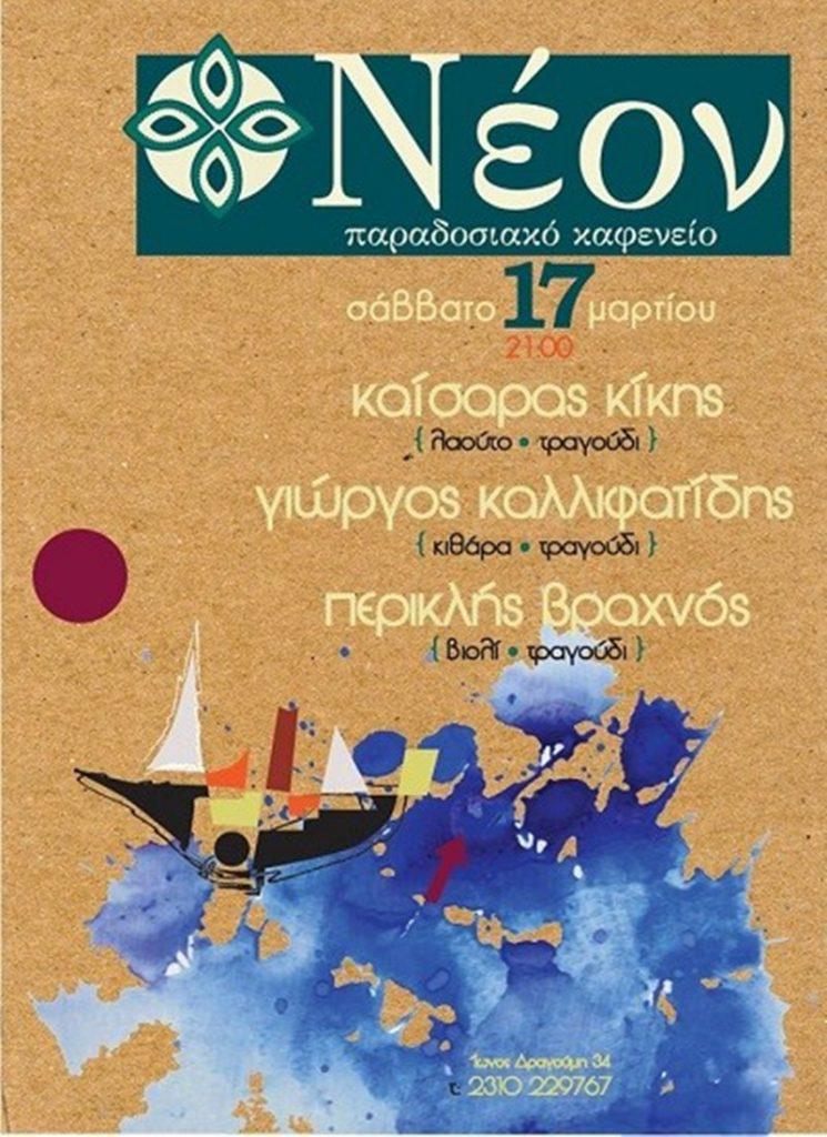*Το Σάββατο 17/3 στις 22.00 στο Καλλιτεχνικό Καφενείο ΝΕΟΝ, Ίωνος Δραγούμη 34, Είσοδος 3 ευρώ, πληροφορίες: 231 022 9767.