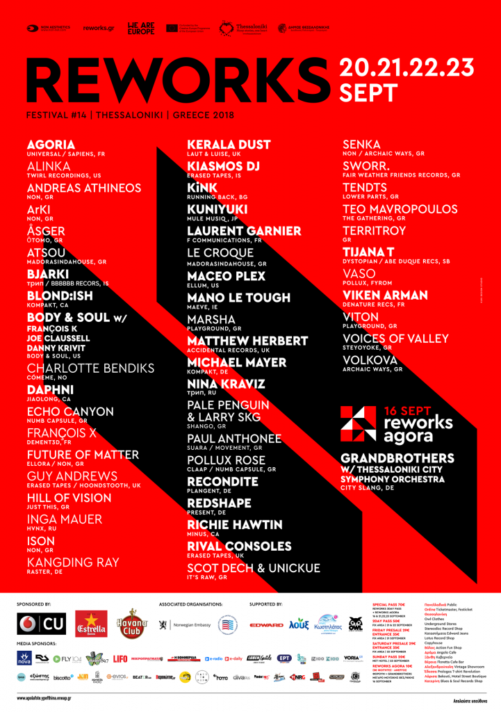 Nina Kraviz, Richie Hawtin, Laurent Garnier, Maceo Plex, Caribou aka Daphni, Body & Soul w/ François Kevorkian, Danny Krivit, Joe Clausell, Matthew Herbert, KiNK, Agoria, Recondite, Kiasmos DJ, Grandbrothers, Rival Consoles, Redshape, Bjarki, Mano Le Tough, Michael Mayer, Francois X, Alinka, Tijana T, Blond:ish, Kerala Dust, Kangding Ray, Kuniyuki, Inga Mauer, Guy Andrews, AND.ID, Charlotte Bendiks, Viken Arman, Territroy, Sworr, Ison, Tendts, Future Of Matter, Andreas Athineos, ArKI, Viton, Paul Anthonee, asger, Pollux Rose, Atsou, Hill Of Vision, Echo Canyon, Volkova, Marsha, Pale Penguin & Laryy SKG, Voices Of Valley, Le Croque, Scott Dech & Unickue, Vaso, Teo Mavropoulos, Συμφωνική Ορχήστρα Δήμου Θεσσαλονίκης