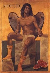 «Ο Αύγουστος ήταν για μένα, όταν ήμουν παιδί, κι είναι ακόμα, ο πιο αγαπημένος μου μήνας· αυτός φέρνει ,μαθές , τα σταφύλια και τα σύκα, τα πεπόνια, τα καρπούζια· τον ονομάτισα Άγιον Αύγουστο· αυτός ο προστάτης μου, έλεγα, σε αυτόν θα κάνω την προσευκή μου· όταν θέλω τίποτα, από αυτόν θα το ζητώ, κι αυτός θα το ζητήσει από το Θεό, κι ο Θεός θα μου το δώσει. Και μια φορά πήρα νερομπογιές και τον ζωγράφισα: Έμοιαζε πολύ του παππού μου του χωριάτη(…) Από τη στιγμή που τον ζωγράφισα και στερέωσα το πρόσωπό του, στερεώθηκε και μέσα μου η εμπιστοσύνη μου σε αυτόν, και κάθε χρόνο τον περίμενα να ‘ρθει, να τρυγήσει τ’ αμπέλια της Κρήτης, να πατήσει τα σταφύλια και να κάμει το θάμα του, να βγάλει από τα σταφύλια κρασί. Γιατί, θυμούμαι, το μυστήριο τούτο με τυράννησε πολύ —πώς μπορεί να γίνει το σταφύλι κρασί· μονάχα ο Άγιος Αύγουστος μπορούσε να κάμει ένα τέτοιο θάμα· κι έλεγα: «Αχ, να τύχαινε να τον συναπαντήσω μια μέρα στο αμπέλι που είχαμε απόξω από το Μεγάλο Κάστρο και να τον ρωτήσω να μου πει το μυστικό. Τι ‘ναι το θάμα τούτο δεν καταλάβαινα. Η αγουρίδα γίνεται σταφύλι, το σταφύλι γίνεται κρασί, το κρασί το πίνουν οι άνθρωποι και μεθούνε· γιατί μεθούνε; Όλα αυτά μου φαίνουνταν μυστήρια φοβερά, και μια φορά που ρώτησα τον πατέρα μου, αυτός μάζεψε τα φρύδια: «Μη φυτρώνεις εκεί που δε σε σπέρνουν!» μου αποκρίθηκε.»