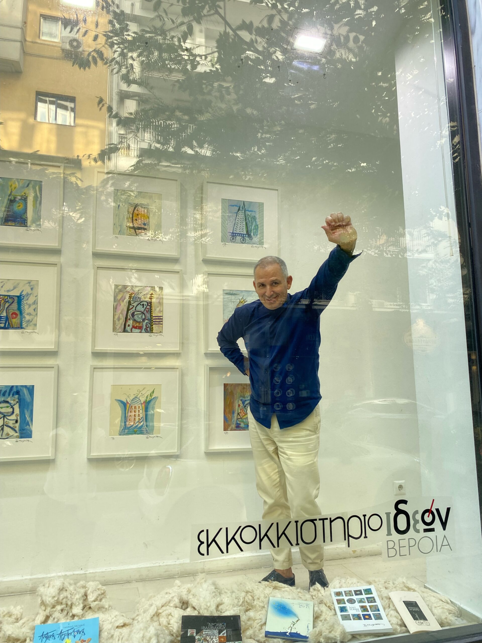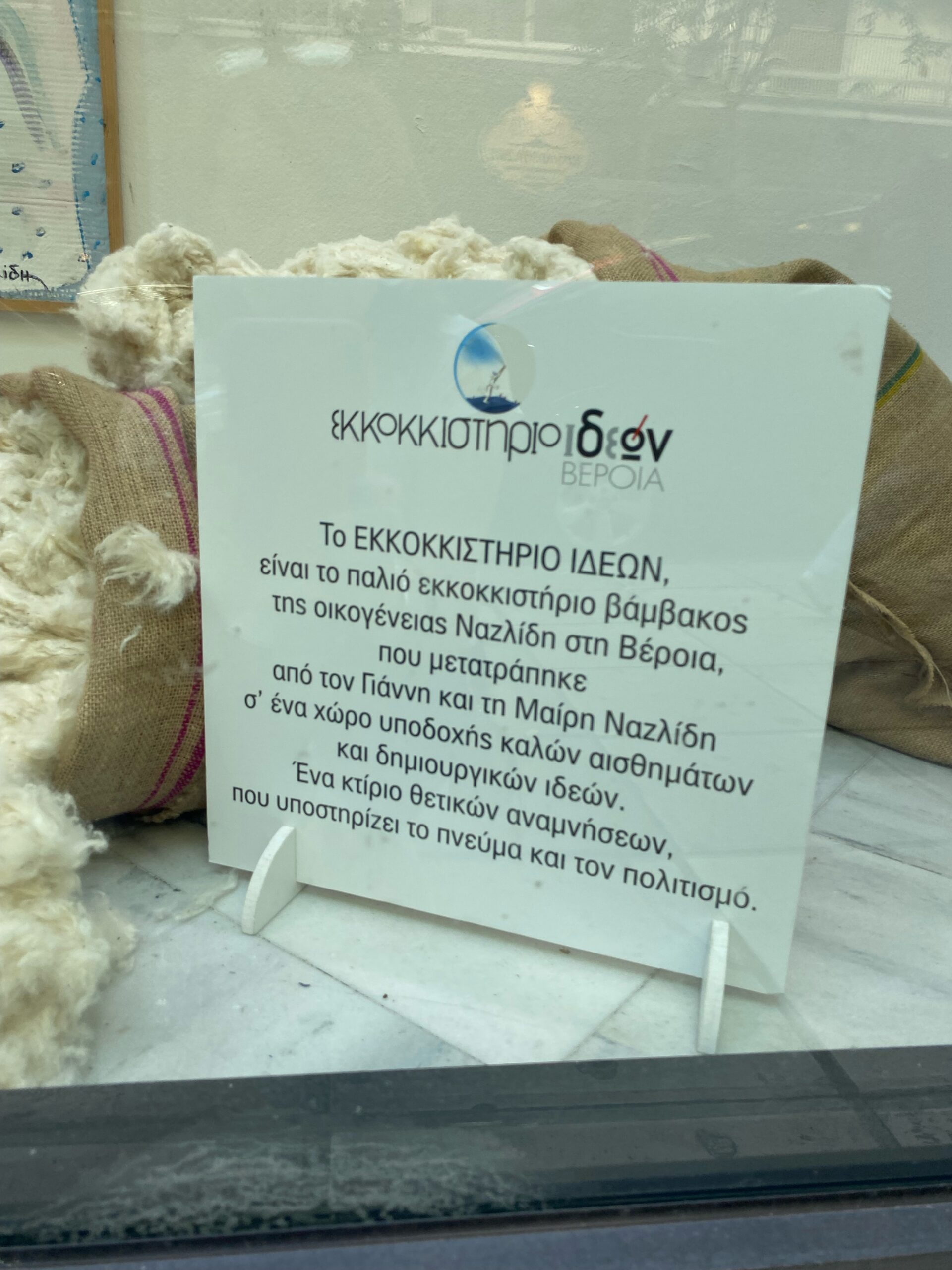 Επισκεφτήκαμε στη Βέροια το Εκκοκκιστήριο και κάτω από ένα πλατάνι και την ζεστή φιλοξενία του Γιάννη και της Μαίρης, η συγγραφέας, Νίκη Γκύζη συγγραφέας και o Γιάννης Αργυριάδης σκέφτηκαν να φιλοξενήσουν τον ζωγράφο Γιάννη Ναζλίδη και την ιδέα του ζευγαριού στις Βιτρίνες Τέχνης του ΟΤΕ.