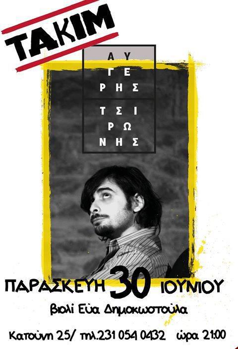 Ο Αυγέρης Τσιρώνης ανεβαίνει από την Λαμία στη Θεσσαλονίκη, πάει στο ΤΑΚΙΜ για μια βραδιά με δικές του μουσικές συνθέσεις καθώς και άλλων αγαπημένων δημιουργών από το χώρο της ελληνικής έντεχνης και ροκ σκηνής. Μαζί του στο βιολί η Εύα Δημοκωστούλα.