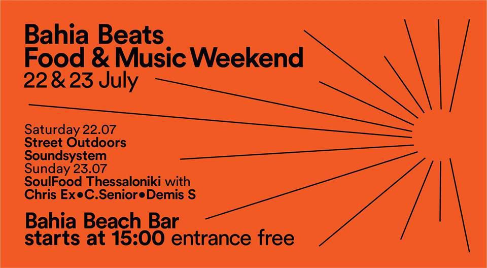 Η Θεσσαλονίκη (και) αυτό το Σαββατοκύριακο μετοικίζει στην Χαλκιδική αλλά αυτή τη φορά έχει πολλούς δυνατούς λόγους. Με την υπογραφή του Soul Food Τhessaloniki και του Street Outdoors και με όλες τις εγγυήσεις που συνεπάγεται αυτό, στήνεται ένα από τα μεγαλύτερα πάρτι του καλοκαιριού. Ειδικό μενού στο Bahia Beach Bar για δύο ημέρες και τα ντεκ – φωτιά από τους: Street Outdoors Soundsystem (Σάββατο 22), Chris Ex, C.Senior και Demis S (Κυριακή 23). Με την δύναμη του ιδιαίτερου groove τους, τα δυνατά beats, τους tropical disco, afro, brazil και house ήχους αλλά και με την καλλιτεχνική αοκνία τους, δύο μέρες non stop πάρτι στο Bahia Beach Bar, άχαστες.