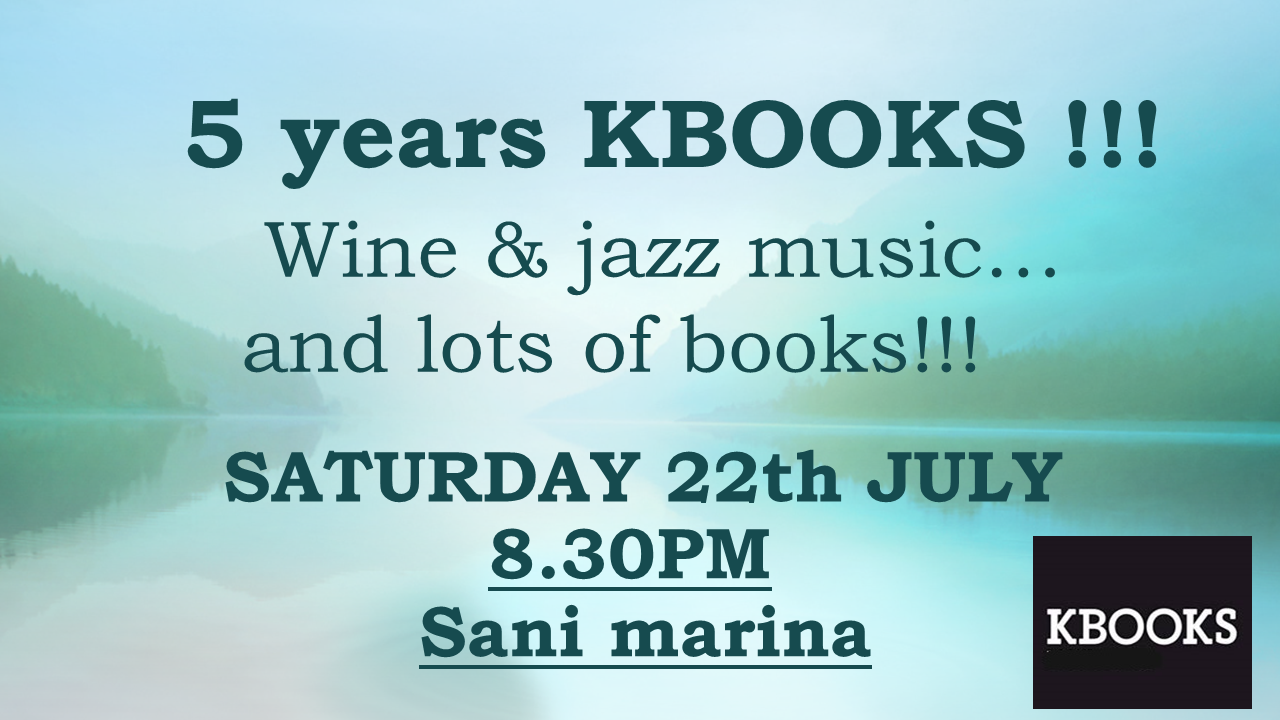 Το KBOOKS at Sani γιορτάζει 5 χρόνια λειτουργίας το Σάββατο 22 Ιουλίου στις 8.30μμ με μια γιορτή στο Sani Marina, μια γιορτή που θα περιέχει κρασί, τζαζ μουσική και πολλά πολλά βιβλία. Σας περιμένει να γιορτάσετε μαζί στο ειδυλλιακό περιβάλλον του Sani resort και να δείτε μαζί τα βιβλία του φετινού απρόβλεπτου καλοκαιριού.