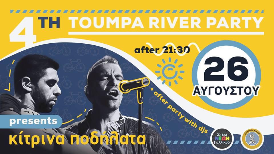 Το Στέκι Νεών Γαλλικού διοργανώνει το 4ο Toumpa River Party το οποίο είναι εδώ και παρουσιάζει το γνωστό ελληνικό μουσικό συγκρότημα “Κίτρινα Ποδήλατα”. Η βραδιά της 26 Αυγούστου προβλέπεται όπως κάθε χρόνο μαγική καθώς με παρέα τους Γιώργο και Αλέξανδρο Παντελιά που είναι οι εμπνευστές και δημιουργοι και τα μοναδικά μέλη,το TRP ήρθε η ώρα να αλλαξει επίπεδο.