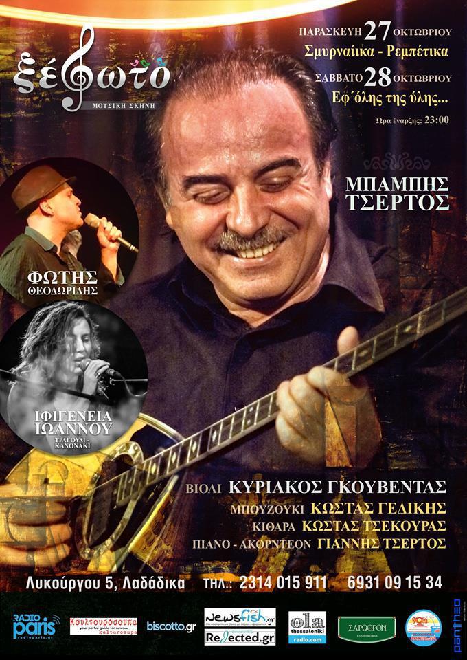 Κι επειδή στη ζωή τα μεγάλα ΟΧΙ και τα μεγάλα ΝΑΙ, μετράνε, εμείς στο ΞΕΦΩΤΟ (Λυκούργου 5, Λαδάδικα), γιορτάζουμε το ΟΧΙ, λέγοντας ΝΑΙ στο αθάνατο ελληνικό τραγούδι, στους καθημερινούς ήρωες και στους αγωνιστές της σύγχρονης Ελλάδας. Μπροστάρης, ο Μπάμπης Τσέρτος. Μαζί του, ο Φώτης Θεοδωρίδης και η Ιφιγένεια Ιωάννου. Για δύο νύχτες γεμάτες μουσική, τραγούδι, κέφι και επικοινωνία.