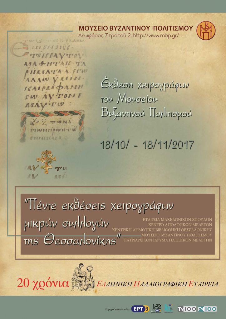 To Mουσείο Βυζαντινού Πολιτισμού παρουσιάζει στο χώρο υποδοχής (φουαγιέ), έκθεση χειρογράφων της συλλογής του, στο πλαίσιο της σπονδυλωτής έκθεσης με θέμα: «Πέντε εκθέσεις χειρογράφων μικρών συλλογών της Θεσσαλονίκης» από τις 18-10 έως τις 18-11-2017. Η μικρή αυτή έκθεση, που περιλαμβάνει χειρόγραφα από τις αποθήκες του Μουσείου, οργανώθηκε με αφορμή τον εορτασμό των 20 χρόνων από την ίδρυση της Ελληνικής Παλαιογραφικής Εταιρείας (ΕΛΠΕ, Θεσσαλονίκη) το 1997. Πρόκειται για δέκα χειρόγραφους κώδικες και σπαράγματα που χρονολογικά, καλύπτουν την περίοδο από τους παλαιοχριστιανικούς έως τους νεότερους χρόνους. Ανάμεσά τους ξεχωρίζει το περγαμηνό ευαγγέλιο του 9ου αι.. Περιέχει τα ευαγγελικά αναγνώσματα του έτους σε μεγαλογράμματη γραφή και τα μουσικά «σημαδόφωνα» για την εμμελή ανάγνωση των περικοπών. Η αντιγραφή του χειρογράφου πιθανόν έγινε στην Κάτω Ιταλία. Εξαιρετικό ενδιαφέρον παρουσιάζει επίσης ένα «καραμανλίδικο» Προφητολόγιο, που χρονολογείται στα τέλη 18ου – αρχές 19ου αιώνα. Περιέχει τις αναγιγνωσκόμενες, σε διάφορες ακολουθίες περικοπές από την Παλαιά Διαθήκη. Η γλώσσα του κειμένου είναι τουρκική (για τους τουρκόφωνους ορθόδοξους της Μ. Ασίας) γραμμένη όμως στο ελληνικό αλφάβητο (= «καραμανλίδικα»), ενώ τα ενδιάμεσα κείμενα, όπου και ορισμένα τροπάρια, είναι γραμμένα στα ελληνικά.
