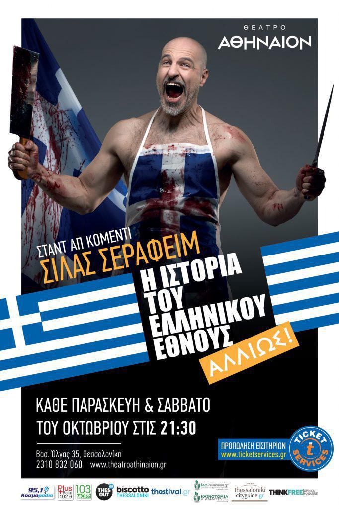 Μετά τις επιτυχημένες παραστάσεις στη μικρή σκήνη, “Η Ιστορία του ελληνικού έθνους – αλλιώς” μεταφέρεται στην κεντρική σκηνή του Θεάτρου Αθήναιον. Από την Παρασκευή 20 Οκτωβρίου και για 4 παραστάσεις ο Σίλας Σεραφείμ, “γράφει” ιστορία. Η ιστορία είναι χρήσιμη, επειδή βλέποντας κανείς το παρελθόν, μπορεί να διαβάσει το μέλλον. Μόνη προϋπόθεση, η αλήθεια των γεγονότων.