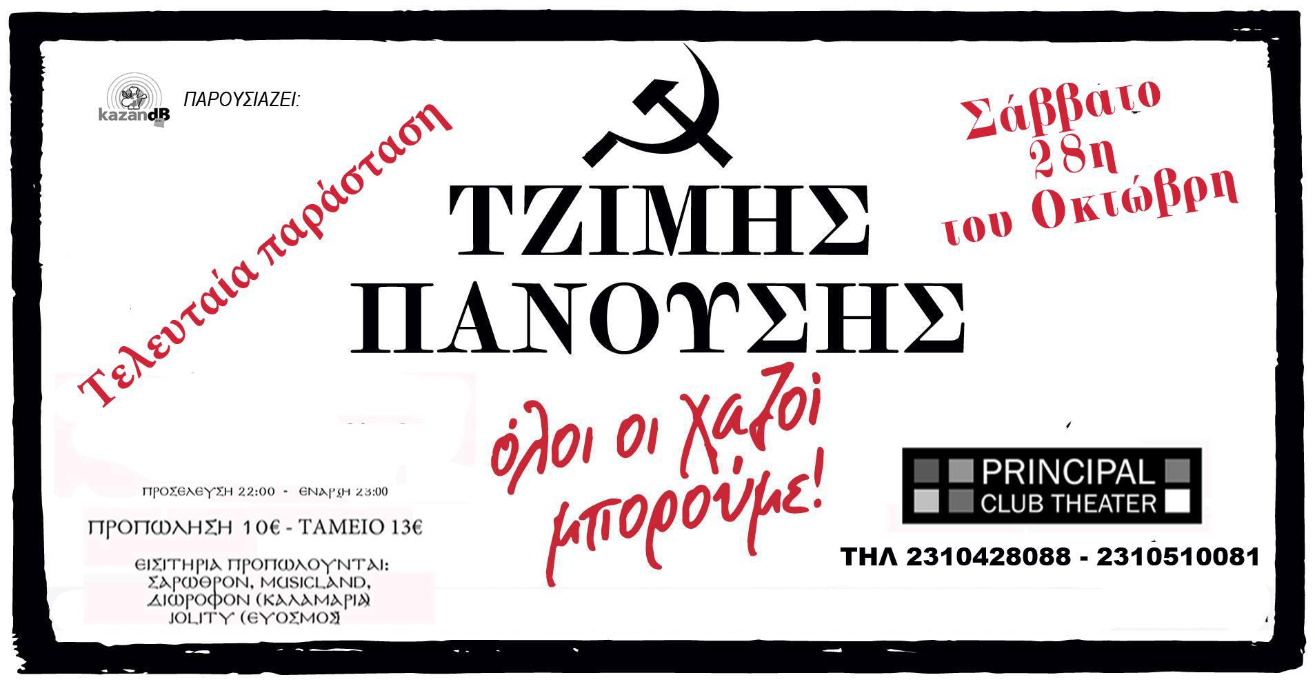 Ο συμπαγής καλλιτέχνης, Τζίμης Πανουσης μετά την αρχαία κωμωδία στην Επίδαυρο και το Ηρώδειο δίνει μια τελευταια παρασταση το Σάββατο 28 Οκτωβριου στο PRINCIPALμε το γελοιόδραμα “Όλοι οι χαζοί μπορουμε” μαζί με το ροκ κουαρτέτο πεταμένα λεφτά.