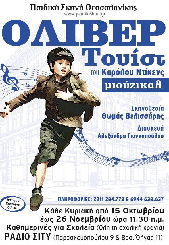 Ο Όλιβερ ένα έξυπνο παιδί με μεγάλη δύναμη ψυχής καταφέρνει και νικά τις δυσκολίες της ζωής στη Βικτωριανή Αγγλία και στέλνει σ’ όλους ένα μήνυμα αισιοδοξίας και χαράς. Τον συνοδεύουν χαρούμενες νότες ξεκαρδιστικά στιγμιότυπα και υπέροχες χορογραφίες που θα σας συναρπάσουν. Επτά ηθοποιοί που χορεύουν τραγουδούν και επικοινωνούν με τα παιδιά ζωντανεύουν την ιστορία του Όλιβερ μέσα σε ένα μαγευτικό σκηνικό που παίρνει ζωή ανάμεσα σε φιγούρες ντυμένες εντυπωσιακά με κοστούμια εποχής.