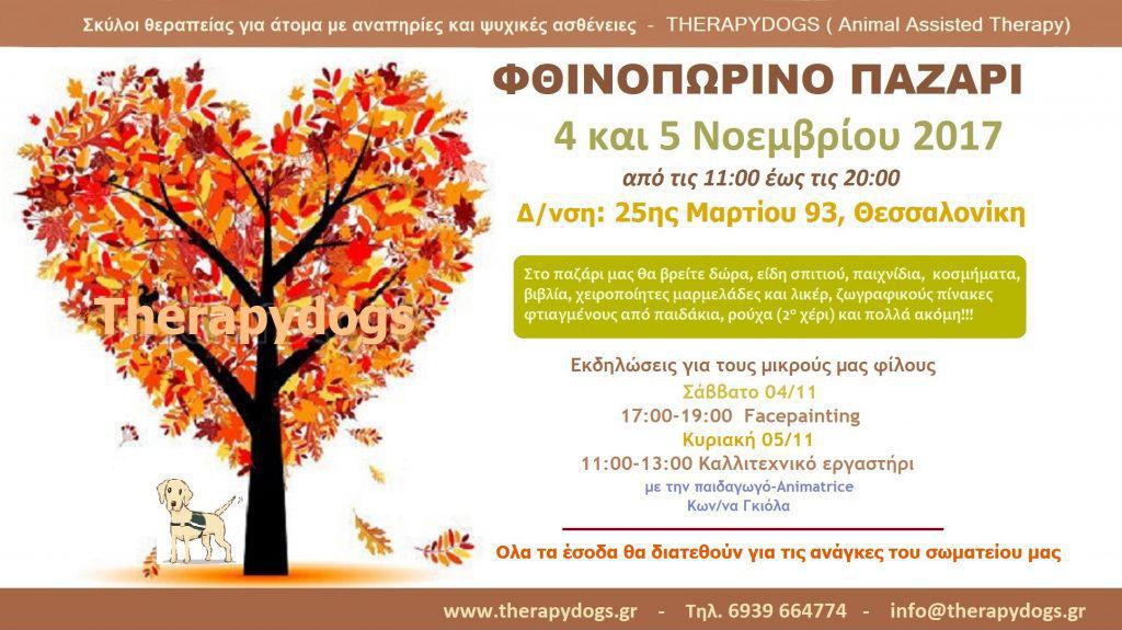 Σας προσκαλούμε όλους στο Φθινοπωρινό μας Παζάρι που θα γίνει στις 04 & 05 Νοεμβρίου 2017, από τις 11:00 έως τις 20:00 στην έδρα μας, 25ης Μαρτίου 93. Στο παζάρι μας θα βρείτε, δώρα, είδη σπιτιού, παιχνίδια, κοσμήματα, χειροποίητα σαπουνάκια, φυσικά καλλυντικά, βιβλία, χειροποίητες μαρμελάδες και λικέρ, παιδικές ζωγραφιές, ρούχα-παπούτσια-τσάντες (2ο χέρι) και πολλά ακόμη! Όλα τα έσοδα, θα διατεθούν για τις ανάγκες του φιλανθρωπικού (μη κερδοσκοπικού) σωματείου Therapydogs.