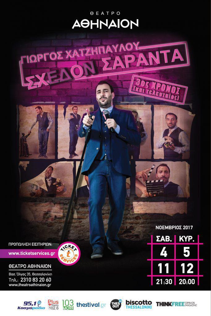 Η τρίτη σόλο παράσταση του Γιώργου Χατζηπαύλου, με τίτλο, Σχεδόν σαράντα, για μία τελευταία σεζόν στην κεντρική σκηνή του Θεάτρου Αθήναιον. Μετά τις sold out παραστάσεις του τη σεζόν που πέρασε και την πρώτη του μεγάλη ευρωπαϊκή περιοδεία σε 9 πόλεις, ο Γιώργος επιστρέφει για λίγες ακόμα εμφανίσεις με την παράσταση που χαρακτηρίστηκε από τις καλύτερες ελληνικές stand up comedy παραστάσεις και αναλύει όλα τα στάδια στη ζωή ενός άντρα αλλά και τη σχέση του με το άλλο φύλο, τη σημερινή εποχή, όλα τα παράξενα που βλέπουμε και βιώνουμε γύρω μας ενώ παράλληλα μας βάζει στον εξωφρενικά περίεργο και αστείο κόσμο της πατρότητας!